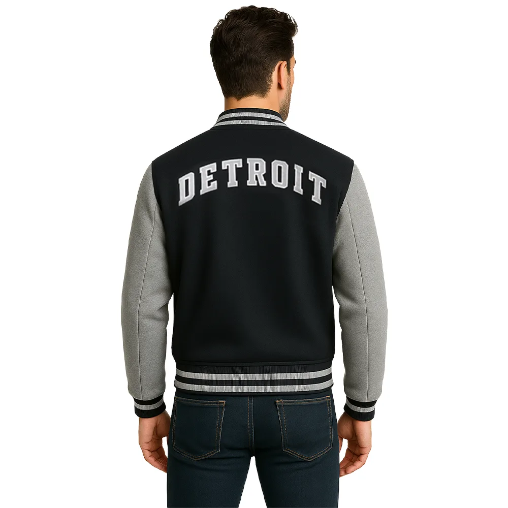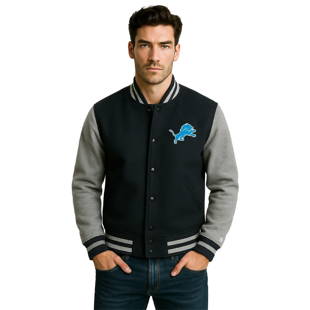 Its wool body gives coziness and rough touch, and the leather sleeves are the contrast and class. It has a real design as the embroidered Detroit Lions logo on the chest makes it bold and authentic, which is a sign of pride and individuality. All the details, including the ribbed cuffs, the structured collar, and so forth, have been carefully designed to create the ideal fit and feel.