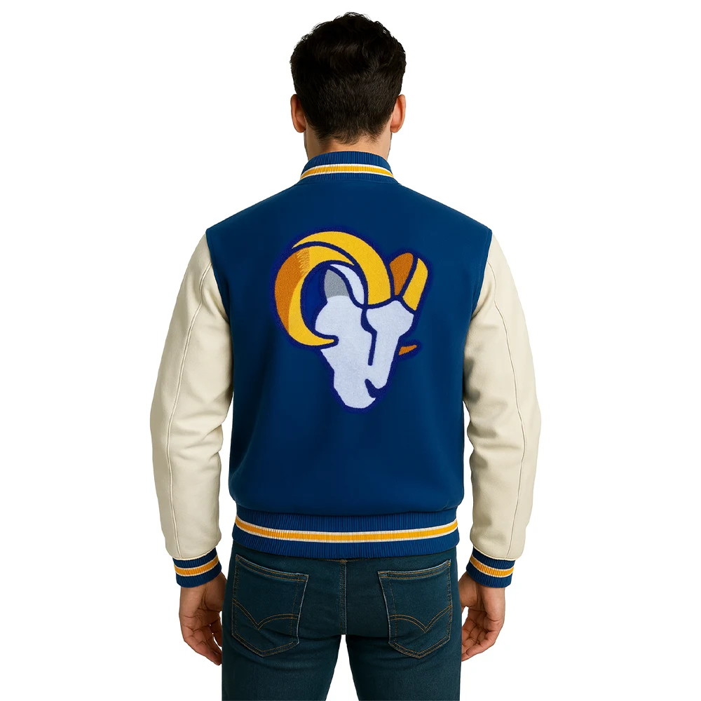 The Los Angeles Rams varsity jacket is unique since it takes the classic appearance of the varsity outerwear and a contemporary expressive twist to it. The traditional lineage is still present as the retro figure is quite noticeable, but the color schemes and the way the patterns are put together add a new twist and make the jacket both exciting and captivating. The rams varsity jacket enjoys popularity among fans who prefer to experience a sense of nostalgia, and at the same time, have a chance to be fashionable without the need to lose one of the traits.