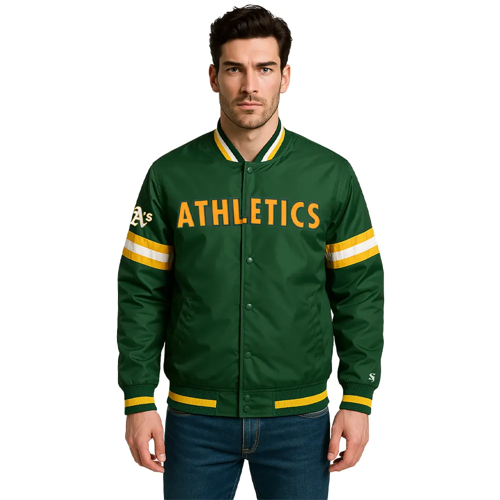 In general, the Athletics Green Scout varsity jacket is a functional and comfortable item that can be worn by everyone. It could be worn on casual trips, or some light sports or even social gatherings but still has a very clean and contemporary appearance. It can be worn throughout the year because of its diversity and stability.