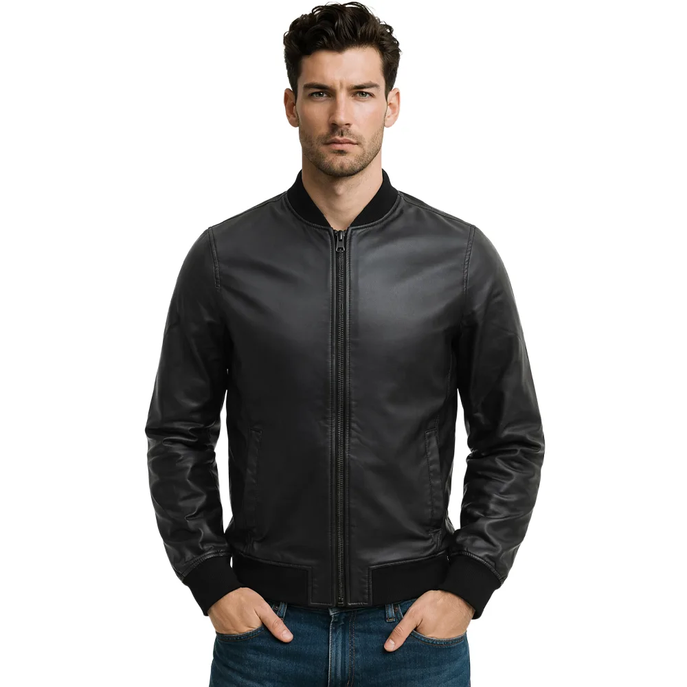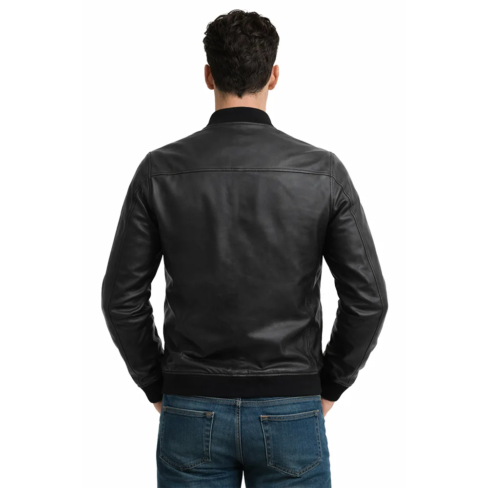 Men’s Casual Zipper Black Leather Bomber Jacket