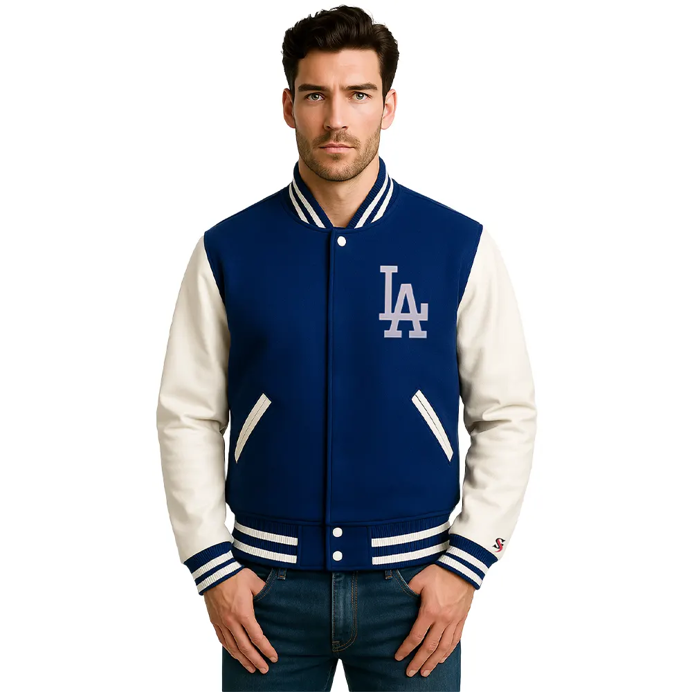 Los Angeles Dodgers varsity jacket is normally made of a high quality mixture of cotton and polyester. This blend is soft, durable and comfortable. The outer layer is protective against light wind and chilly weather, whereas the inner lining keeps one warm and breathable. The design will help to position itself comfortably and does not limit movement.