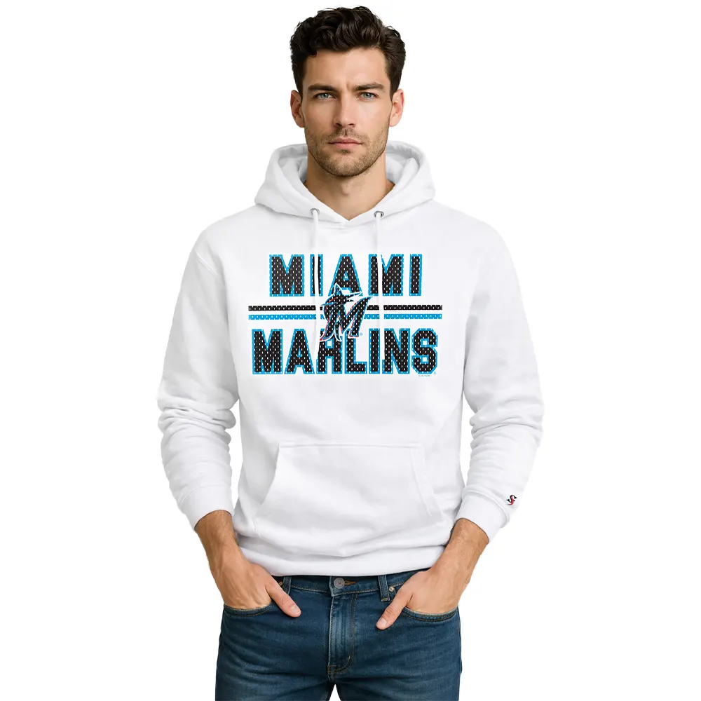 The Miami marlins logo is conspicuously positioned so as to draw attention, but is not overdoing it. The coloring and design of it have a slight contrast to the white mesh backdrop which makes the brand stand out but does not overwhelm the garment. The logo helps to strengthen the tie to the team as well as adding to the overall appeal of the hoodie. This light structure and strong branding form a balanced design, which appears purposeful and stylish.