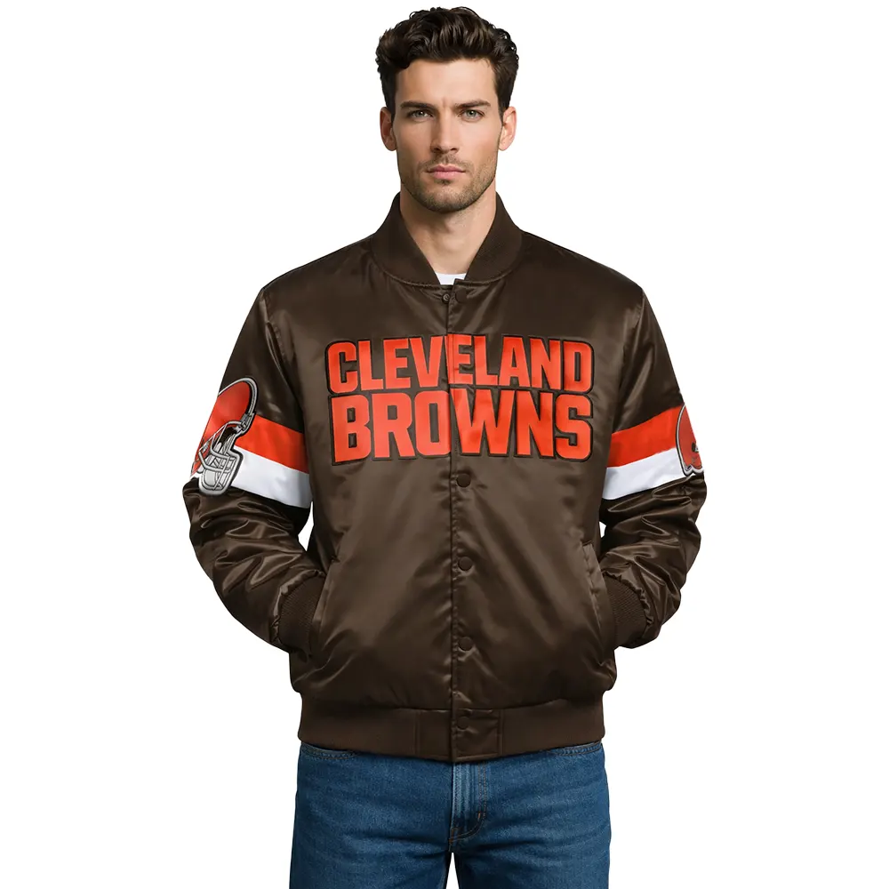 The cleveland browns satin jacket gives it a smooth and glossy finish. It makes the entire look much better yet easy to carry around. The material is soft to touch, and it gives a polished surface that is exceptional to the eye. This type of clothing is in favor of style and comfort.