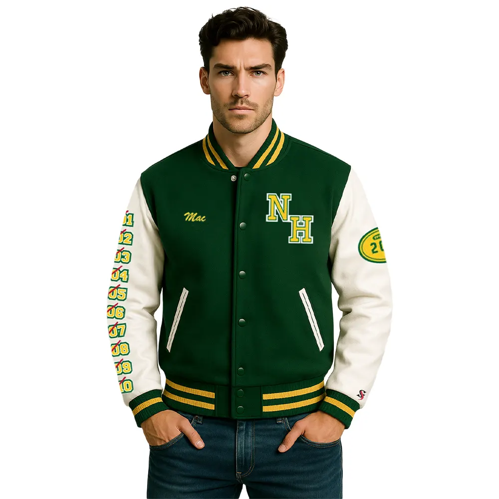 This mens N. Hale High School green and white varsity jacket is an all versatile and stylish outerwear that can be combined with school pride, comfort and classic sportswear. The materials are so durable, the inner lining is soft and there are embroidered decorations that make it a perfect choice at the end of the day to the fans and the alumni. This green and white varsity jacket green and white is an item that is worn during a game day, on a casual outing, or as a part of a collection, but it is a symbol of tradition, loyalty, and othereless sports inspired style.