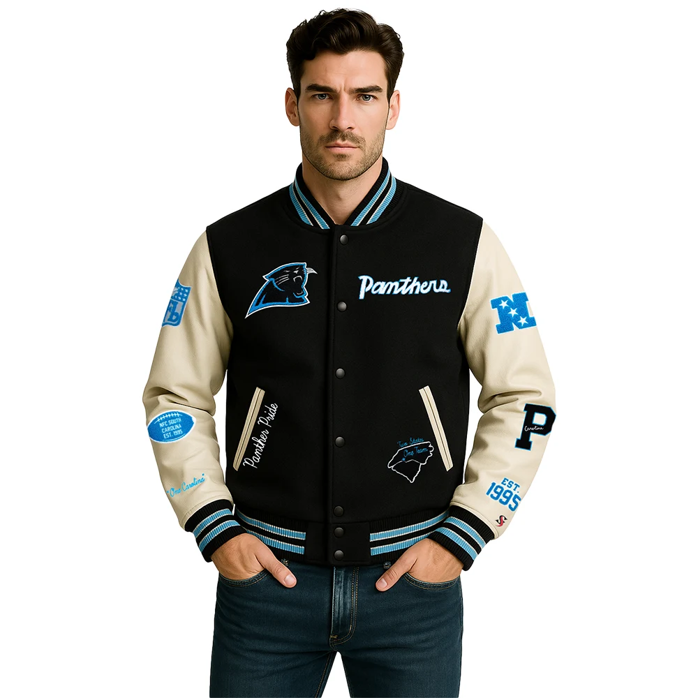 The carolina panthers letterman jacket also upholds more creative outfit concepts. It can be worn with patterned tops textured fabrics or with unique accessories to give fans expressive looks. The color scheme and shape are very strong, and the silhouette is well organized, which makes it the best fit among those willing to express creativity with the help of fashion.